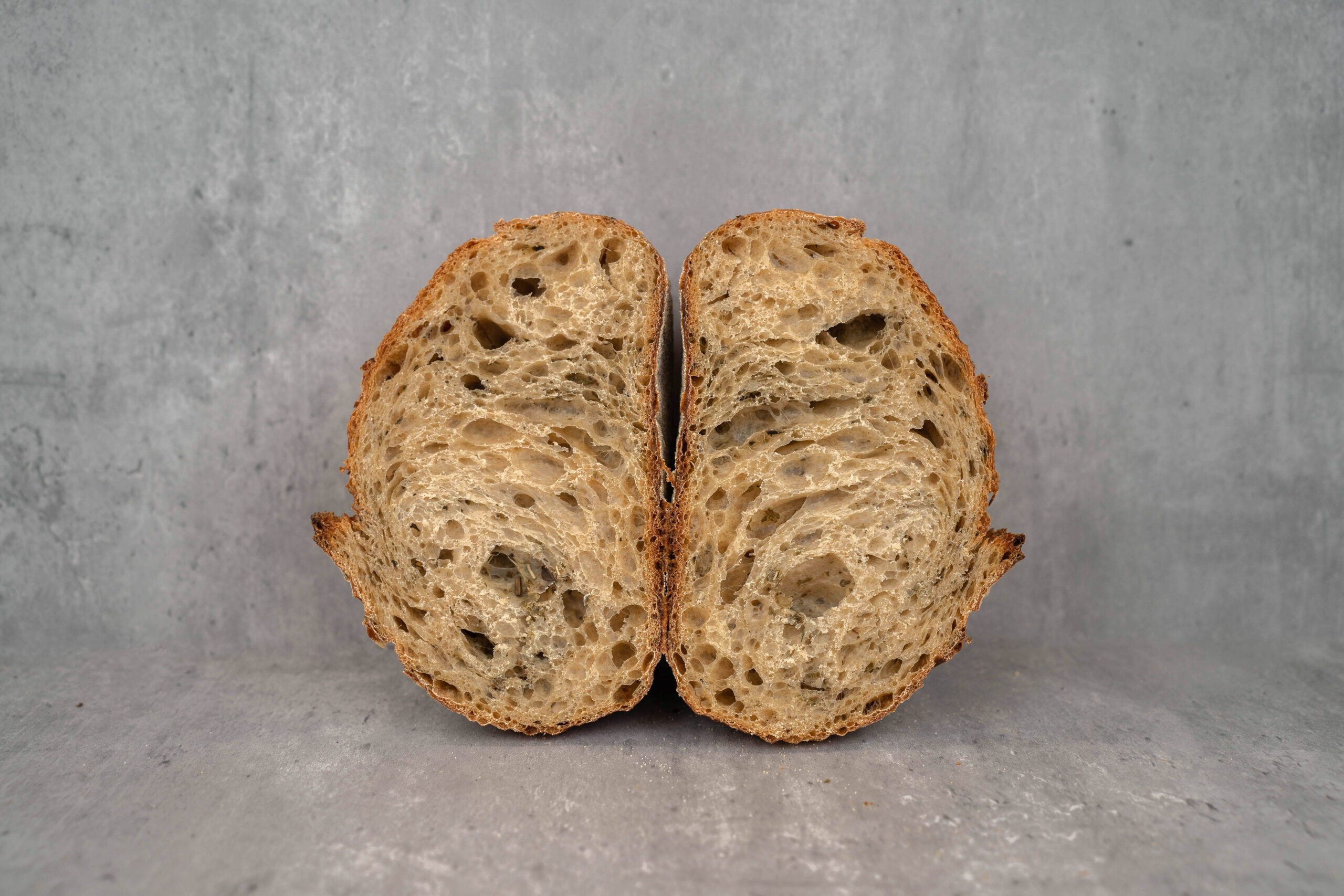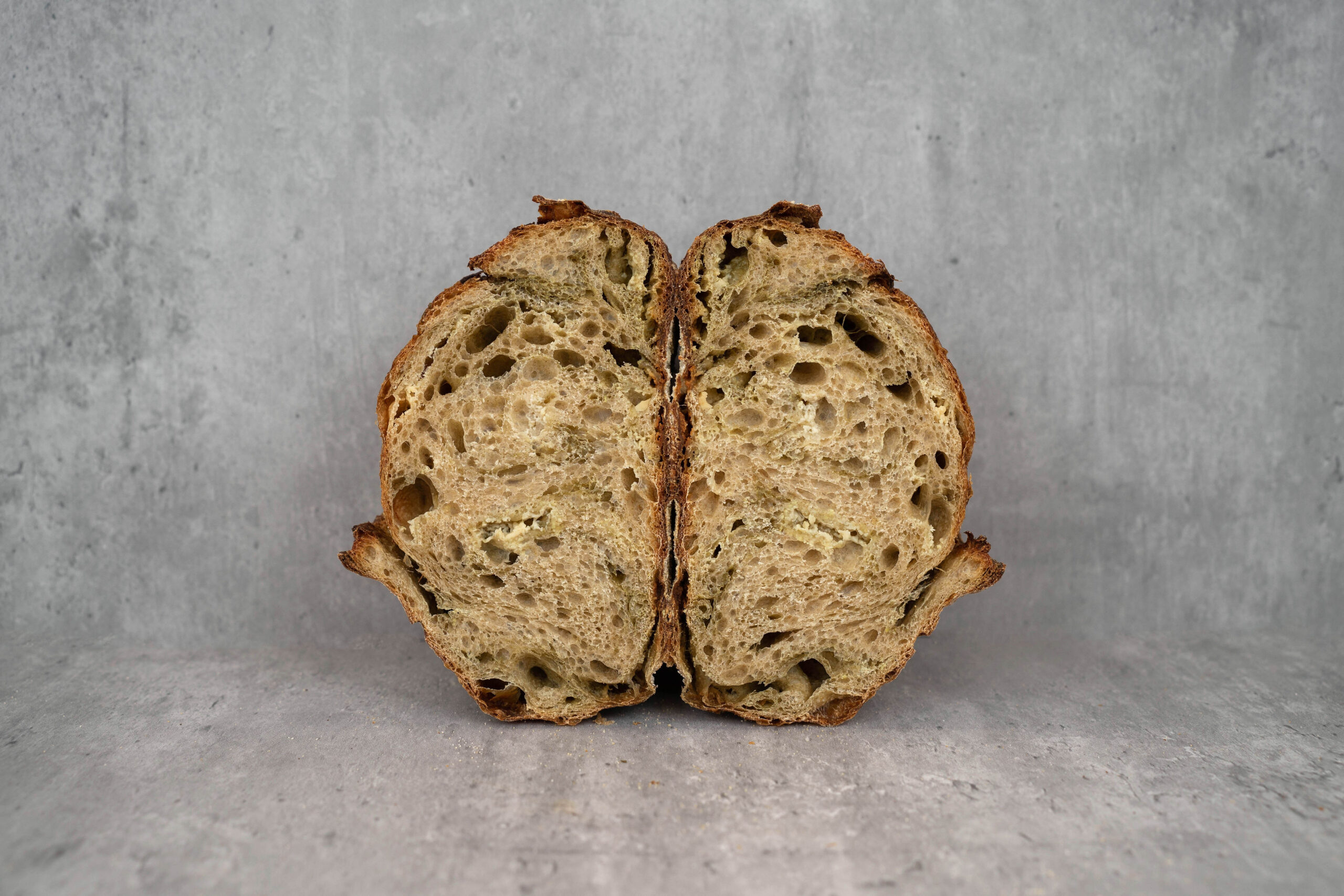 Harina orgánica blanca, Harina integral orgánica, Harina integral orgánica, sal marina y agua, ajo fermentado y orégano